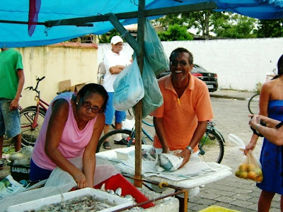 -“Olha o peixe! Temos filé de pescada, camarão, lula, ostra…” É o Santana, um peixeiro da Ilha Comprida que na última barraca, já no fim da rua encerra a feira. É a feira! É a feira.